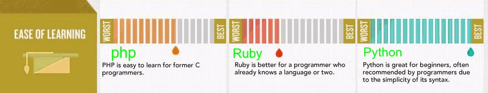 Ease of learning or learning curve is essential when choosing a programming language for your career or next web app development project. A programming language with a high learning curve value is easy to understand and has pretty clean codes. Python has the best learning curve among these three languages, PHP comes second, and Ruby-on-rails is last.