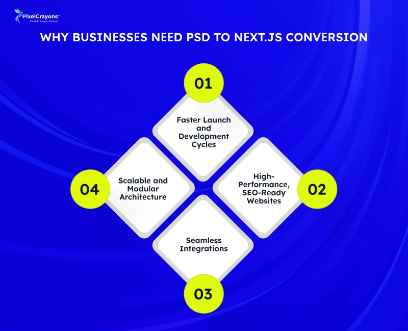 Converting your PSD designs into Next.js websites ensures your website is visually accurate, fast, and optimized for growth. Here’s why businesses rely on PSD to Next.js conversion services: